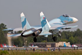 Přistání Su-27P, který je využíván skupinou "Sokoly Rossii" z Lipeckého výcvikového centra, v Kubince na výstavě ARMIJA-2015.